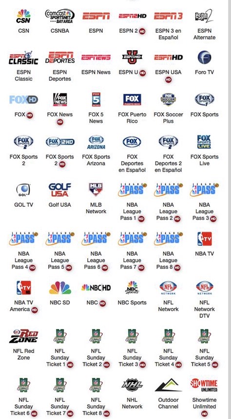 NFL Red Zone, NBC NFL Sunday Night Football, NFL Sunday Ticket 1, NFL Sunday Ticket 2, NFL Sunday Ticket 3, NFL Sunday Ticket 4, NFL Sunday Ticket 5, NFL Sunday Ticket 6, NFL Sunday Ticket 7, NFL Sunday Ticket 8, NFL Sunday Ticket 9, BEIN Sports, BEIN Sports Español, Benfica TV, CBS HD, CBS HD 2, CBS SD, CBS Sports Network, ESPN 2 HD, ESPN 2 SD, ESPN Deportes, ESPN HD, ESPN News HD, ESPN SD, ESPN U, ESPN USA HD, FOX, FOX HD, FOX Sports HD, FOX Sports SD, FOX Sports 2 HD, FOX Sports 2 SD, FOX Sports En Español, GOL TV, GOLF USA, MLB Network, NBA League Pass 1, NBA League Pass 1 HD, NBA League Pass 2, NBA League Pass 3, NBA League Pass 4, NBA TV HD, NBA TV SD, NBC SD, NBC Sports, NBX Sports, NFL Network HD, NFL Network SD, NHL Network HD, SKY Sports 1, SKY Sports 2, SKY Sports 3, SKY Sports 4, SKY Sports F1, SPOR TV1, SPOR TV2, SPOR TV3, SUN Sports, TBS USA, Tennis Channel, The Fight Network, TNT NBA, UFC Network, UFC Night, UFC SD, Univision Deportes 2, Univision Deportes 2 SD, Univision Deportes HD, Univision Deportes SD